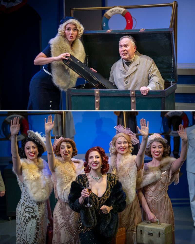 Jeff Gallup gives a determination to Billy Crocker, pursuing a soon-to-be-married woman. He sings passionately of how he feels about Hope (Allison Meyer) in “Easy to Love,” dancing with her and holding her close. In “It’s De-Lovely,” he sings joyfully of her reciprocating, though beginning comically, in drag. “All Through the Night” has him clinging to his love even at his lowest point.