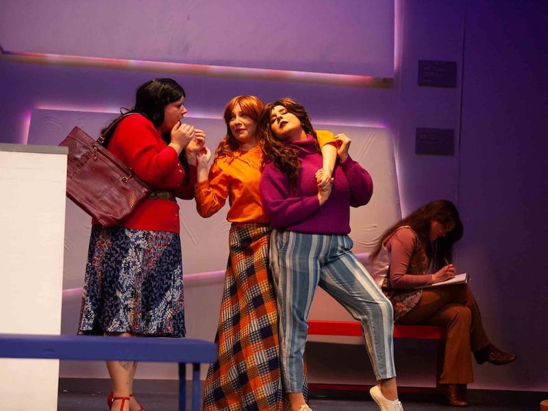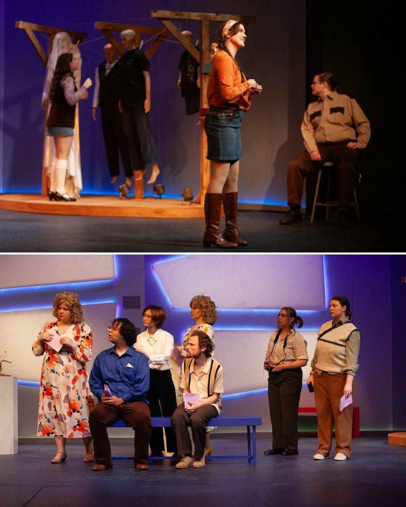 Scenic Designer Gabby Bly creates an exhibit space highlighting the unusual art. At audience left are several pedestals to hold sculptures, while on the opposite side, mannequins hang on a clothesline, with a tray of clothespins on the side. In the back are four large painting-like pieces hanging on the wall. Benches are throughout the stage. Costume Designers Olivia Comeau and Nyla Washiewicz keep the large cast of characters immediately distinguishable. The two Barbaras wear similar floral dresses, while Francoise is in a red pantsuit.