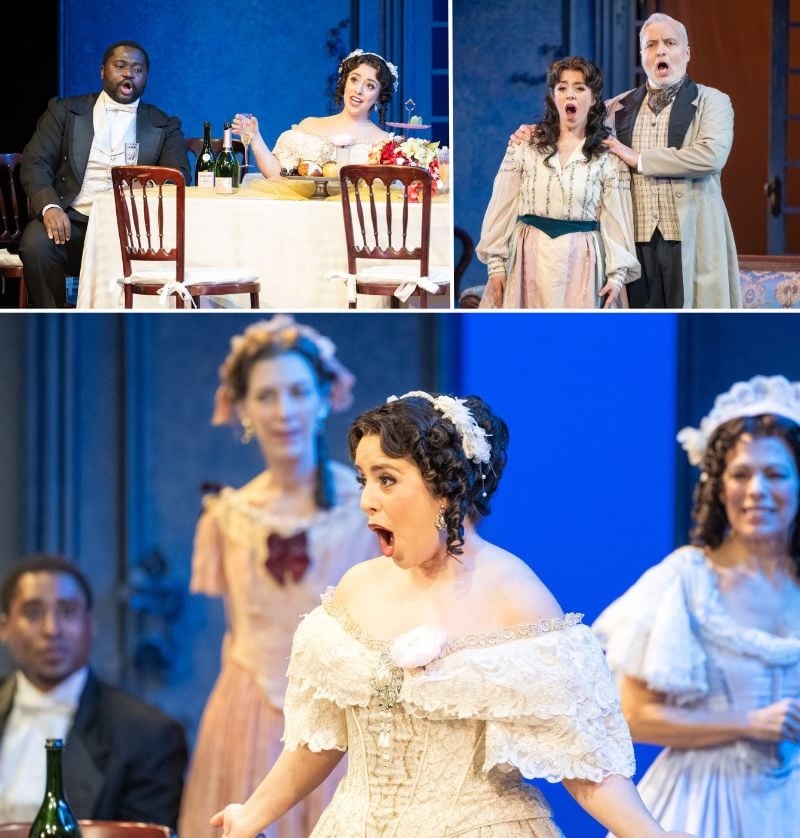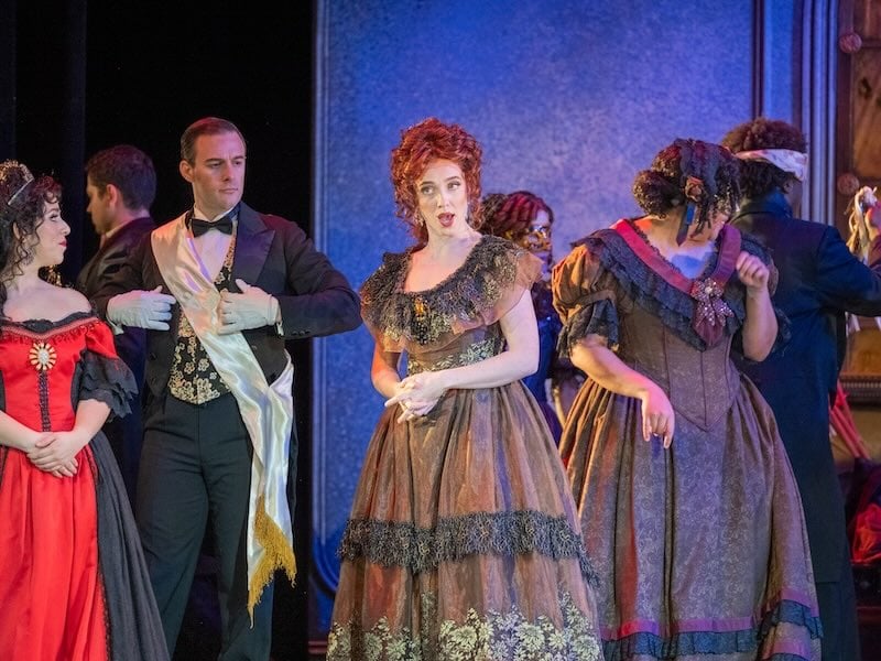 Props Run Crew Liliana Cudley fills the stage with period-looking chairs, tables, and sofas. Wardrobe Supervisor Sharlene Clinton and Wig/Make-up Designer Priscilla Bruce recreate the era with long dresses for the women and vests, jackets, ties, and top hats for the men. Violetta begins in a dress with bare shoulders, before changing to a colorful skirt, and ending in a nightgown. The outfits for the fortunetelling and matador sequences pop with color. Lighting Designer Chris Brusberg enhances the changing emotional atmosphere with different lights. In Act Two’s country house, the backdrop is lit with orange, while blue light bathes the stage in Violetta’s final scene.