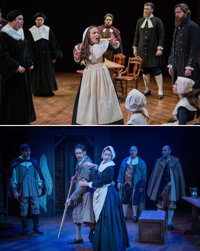 Costume Designer Sally Boyett and Wig and Hair Designer Tommy Malek reflect Puritan-era Massachusetts, with long, simple dresses and bonnets for the women and dark coats and pants for the men. Tituba wears a colorful shawl and headdress, while Deputy-Governor Danforth and Judge Hathorne look imposing in their long, black robes and caps.