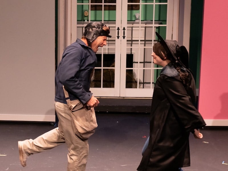 The intimate space of Hylton’s Gregory Theatre gives the audience the unique opportunity to be only a few feet away from the performers. This intimacy fosters a strong connection between performer and audience, enhancing the overall theatrical experience by allowing audience members to feel immersed in The Westing Game. Walking into the open seated space, the audience is met with colorful flats representing the six apartments of the heirs and a set of double french doors centerstage. Set designer Nick Mastrangelo meets the challenge of multiple settings by creating flats that later become the Westing mansion, the apartment lobby, and a hospital room. Going from the Sunset Towers to the Westing Mansion was the most impressive transition, eliminating the french doors to reveal another room with a fireplace and rotating all the apartment set pieces. Set changes were occasionally slowed due to the limited number of run crew available to Prince William Little Theatre, but no set change delayed the start of another scene. All hands were on deck for the challenging set transitions (including cast) and stage manager Darcy Heisey’s meticulous deck organization made transitions move as smoothly as possible.