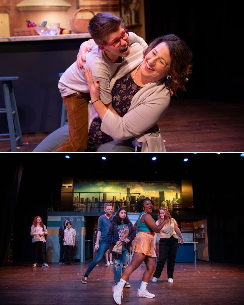 The show is written with many challenging set changes, requiring swift and choreographed transitions. Myke Taister’s two-level fixed set helped solve this challenge and allowed scene changes to not interrupt the pace of the production. With the use of a door center stage, a living room stage left, a school setting stage right, and a city skyline on the second level, Taister created a multi-functioning set for the actors to use with ease. Costume design by Judy Whelihan and Robin Worthington enabled the actors to successfully complete multiple quick changes. In some cases, this also required hair and makeup changes created by Natalie Turkevich. Lighting design was provided by JK Lighting and sound design by Alan Wray. With the show demanding complex technical elements, it was clear that the meticulous planning of the technical team supported the production’s artistic vision.
