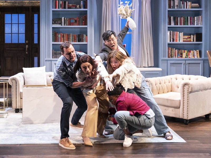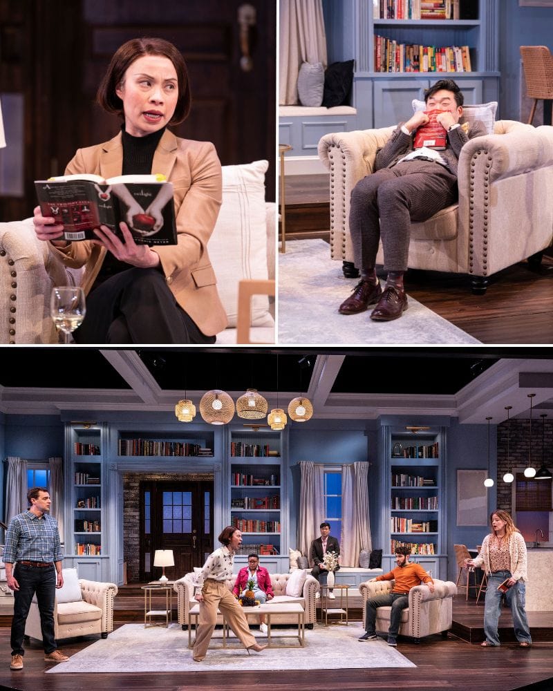 Ana Smith is the leader of the book club, a successful newspaper columnist who lives her perfect life with her good-natured husband in her beautifully curated home (an aspirational living room library set up in pale blue and cream designed by Andrew Cohen). And there is nothing she loves more in her little fiefdom than her book club. As played by Tuyêt Thį Phåm with exactness and control, Ana believes that book club brings out the best in people, creating community and elevating conversations. Ana has agreed to allow the legendary Danish filmmaker Lars Knudsen (the “K” is emphatically vocalized by all) to film her book club for a documentary that she believes will be screened at Cannes.