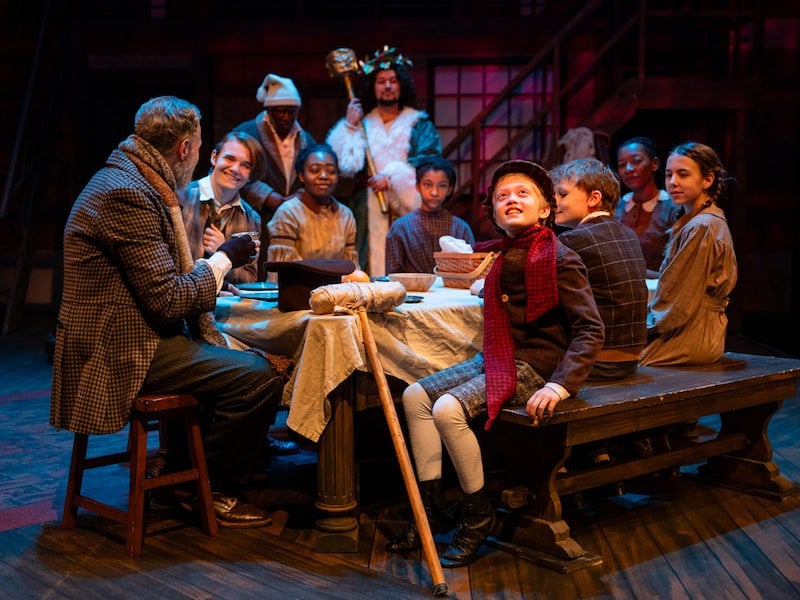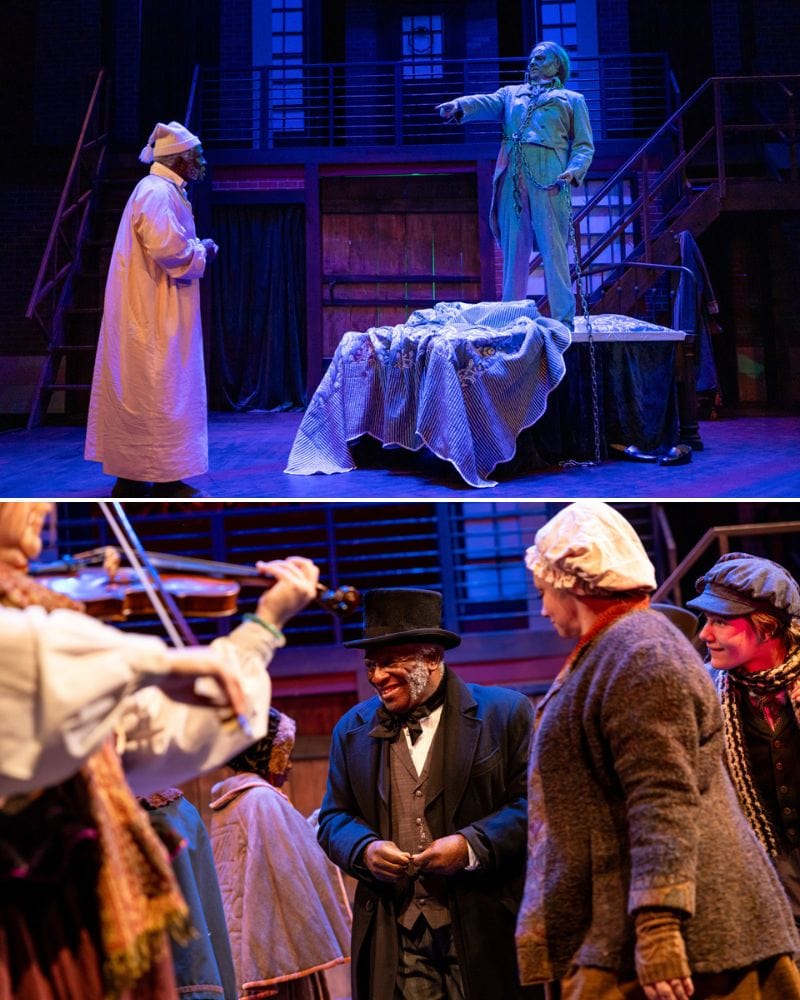 A Christmas Carol is a story about our duty to care for others, and while Scrooge may be on the outside of society, the large ensemble cast creates a sense of conviviality and kindness, all decked out in Victorian finery—plaids and paisleys, red-ribboned bonnets, and green scarves by costume designer Kristina Lambdin. A group of carolers and townspeople become the chorus, narrating Scrooge’s story and retaining much of Dickens’ wry narrative voice, and offering transitions between scenes through traditional Christmas carols (with nods to music director Grace Srinivasan, composer Sarah O’Halloran, choreographer Shea Hemby, fiddler Ellie Cattle, and standout soloists Brandon Shaw McKnight and Lauren Davis for their musical contributions).