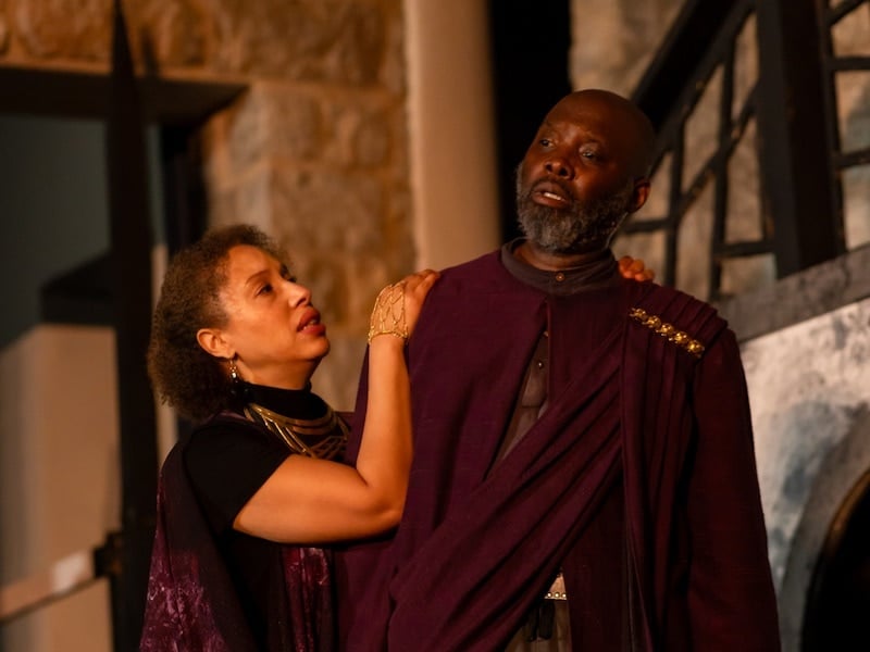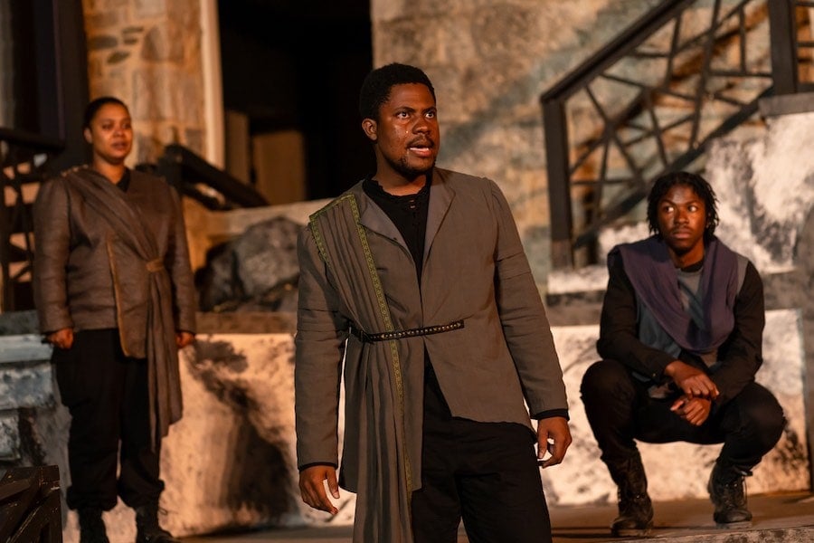 In an opening note about the Black Classical Acting Ensemble, CSC’s Producing Executive Director Lesley Malin offers the brief history that the BCAE was developed in 2021 with Troy Jennings, Dawn Thomas Reidy, and Gerrad Alex Taylor as the current leadership team. Created as an affinity space for Black classical actors and a training ground for new talent, the BCAE has evolved and grown over the last two years with several smaller productions and readings produced in the 2021/22 season, and in this current season—two productions of the Scottish play—one developed specifically for student matinee productions and this enticing Shakespeare-in-the Ruins production. Malin states, too, that the BCAE is already having larger ramifications for the Chesapeake Shakespeare Company: “It has changed how we think about what we produce on our stages, who is leading our productions, and who we are hiring both on and off the stage.”