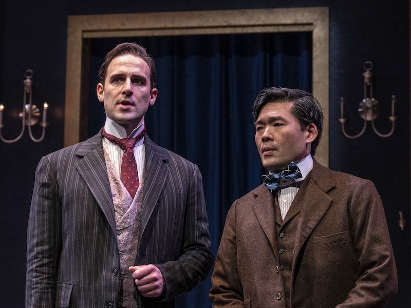 Danny Gavigan plays arguably the world’s most famous fictional detective Sherlock as haughty and more than a bit unhinged (he has several tantrums), while Tony Nam plays Dr. Watson as the straight man, our only link to rationality in an utterly mad world populated with absolutely bonkers characters. As Sherlock is missing for much of the play, Watson must put on the metaphorical deerstalker cap, gather clues, and keep his wits, and it all seems elementary to Nam — who is, by turns stoic, inquisitive, and exasperated.