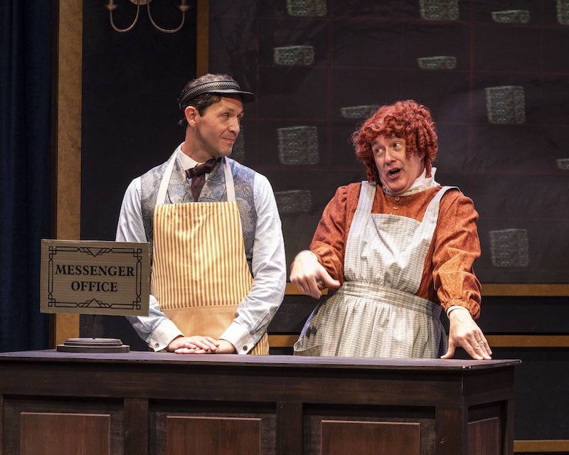 In one dizzying scene as Holmes and Watson visit various London hotels searching for clues, Nelson switches from one of the key secondary characters, the staid Dr. Mortimer, to a flirty and hard-of-hearing shopkeeper’s wife to a Castilian concierge to a Dickensian street urchin and back to Dr. Mortimer in less than four minutes. (Anderson and Kopas also dash around in two or three guises each during this same breakneck scene, including Anderson pulling off a great Maggie Simpson impression as a pacifier-chomping baby in a pram). At times, the farce seems an exercise in, well, exercise as the cast members engage in silly walks, climb up the set, faint (at least a dozen times), and literally chase each other around in circles.