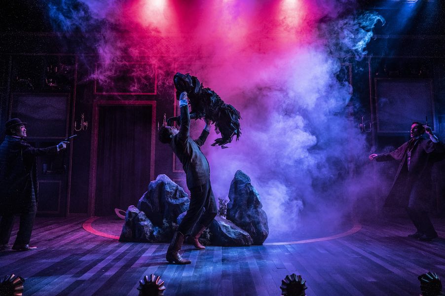 When the action moves to the countryside and we shift into the comedic gothic mode, Paige Hathaway’s set design, Harold F. Burgess II’s lighting, Kelly Colburn’s projections, Town Olufolabi’s sound design, and the puppet hound designed by Dan Jones become more prominent. The set first appears as Sherlock’s home — a large slate-blue paneled sitting room with curios of curiosities, but each panel pulls out to become beds, opera seats, hidden trap doors, and so on, while the bookshelves house the necessary quick props — guns, knives, dollhouses, umbrellas, and more. Together, Burgess’ eerie blue-tinged lighting and Olufolabi’s creaky, creepy soundtrack of Halloween noises make the large manor and accompanying moors even too haunted for the likes of a Heathcliff or Cathy. Every mention of the horse-swallowing bog Grimpen Mire is accompanied by cued suspense music (dun dun DUH!), and Colburn’s projections on three screens create the busy London train station, the facade of the haunted house, the idyllic countryside, a blood-red moon, the shadow of the hound, and a corridor of family portraits (look closely and you will see What We Do in the Shadows’ vampires amongst Renaissance paintings of dour-looking ancestors). And keeping all the lighting and sound cues, dramatic entrances and demented exits, and numerous demises on time are Cat Wallis (stage manager) and Tiffany Ko and Jalon Payton (assistant stage managers).