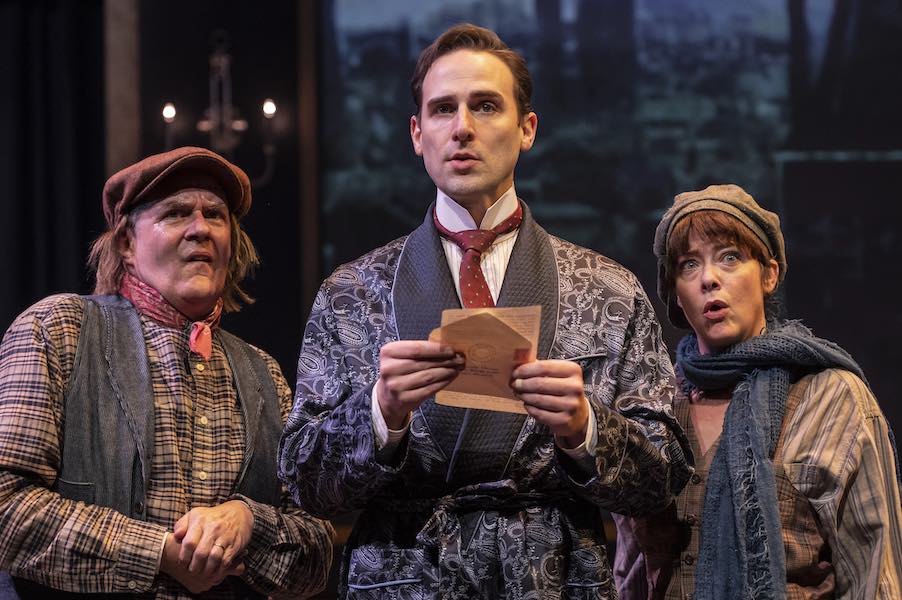 The rest of the cast — Megan Anderson, Drew Kopas, and Bruce Randolph Nelson — play over 40 different characters with 69 quick changes occurring backstage (and sometimes on). From servants to opera singers, shopkeepers and shepherdesses, villains and even damsels in distress, the cast discard their glue-on mustaches and clip-on beards and don new wigs, capes, and accents: from various London social classes as well as a Scottish brogue, a Gaelic trill, a Castilian lisp, a High German growl with “v”/”w” switch, and even a Texan drawl. Once in the moors, Kopas gets a little break by mostly playing one character, the affable and trigger-happy Texan heir Henry Baskerville, a true fish-out-of-water type, while Anderson and Nelson pair off, first as the creepy housekeepers, Mr. and Mrs. Barrymore, and then as the ill-matched siblings, the unbalanced naturalist Jack Stapleton and his enchanting sister Beryl. What brilliant and broad performances from this game team of incredibly gifted comedic actors!