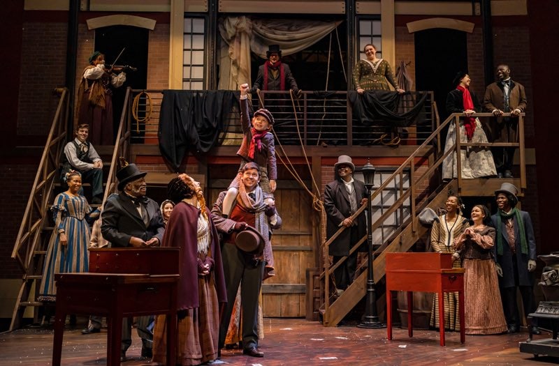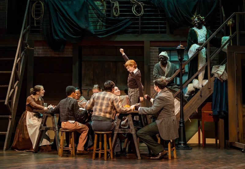 We don’t need that bit of cheeky revisionism, however, to make this an effective adaptation well worth making a part of a family tradition. Directed with warmth and conviviality by Shanara Gabrielle, this adaptation is lively, musical (traditional carols, hymns, jigs, and gospels are performed throughout, and often accompanied by Ellen Cattle on fiddle), spirited, and sentimental.