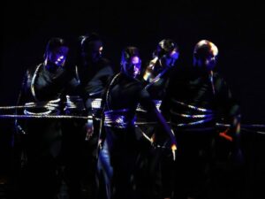 The first number, titled “Enredo” like the entire program, features the ensemble emerging from the darkness, tethered together by a giant rope, and their convoluted negotiations with this rope as they pull apart and come back together. It’s a spellbinding piece.