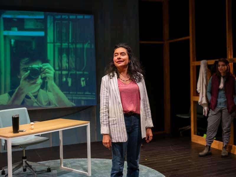 Loomer and Fernandez find moments to break the tension with humor. On one occasion, roughly midway through the play, Fernandez asks the audience to get up and stretch, explaining that it’s no longer possible to mount a two-act play in American theater.