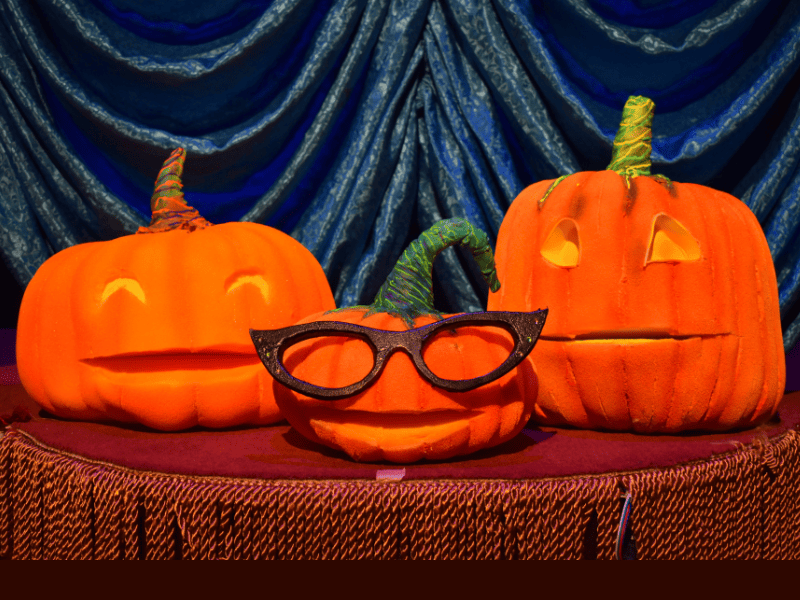 This production, with pumpkins and neon-green lights surrounding the stage and social distancing stickers on the floor, is comfortable and safe Halloween entertainment. The stage design, also from Dapo, looks appropriately spooky as well; the audience is pulled into an old mansion that sets the mood behind the puppeteers, with candles in the center, well-designed stained glass windows on either side, and tombstones that abound.