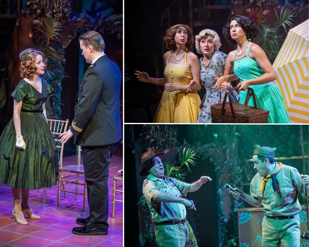 Scenic Designer Salydon Boyken turns the stage into a tropical paradise, with vines, flowers, and plants all around. The backdrop is a metal screen with elaborate work, while the floor is Spanish tile. Canvas chairs, desks, and tables enter as needed. Costume Designer Sally Boyett and Wig Designer Tommy Malek recreate the 1950s with bright dresses and bikinis for the women, as well as suits for the men, who also wear naval officer and sailor uniforms. Dogberry and his associates wear Boy Scout uniforms.